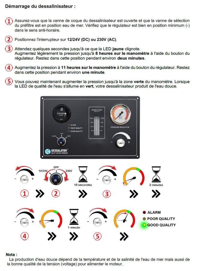 Etape 5 : Monter lentement en pression en tournant la molette vers la droite. La pression monte doucement sur l'indicateur, l'eau de mer qui avant allait directement à la mer commence à venir vers les filtres